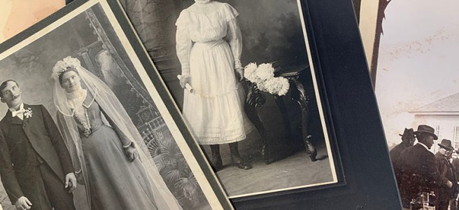 I’m looking at the photographs in the box today. Two are loose; three rest inside the cardboard-bound album. My first thoughts surround what people are wearing in the photographs, but I’m finding it difficult to separate myself and my thoughts from my impulses to preserve. I’m not using gloves as I handle these, though I am using dry, clean hands. I can tell that someone took great care of these; the yellowing that might indicate acidic based paper really only is present in the cardboard case.