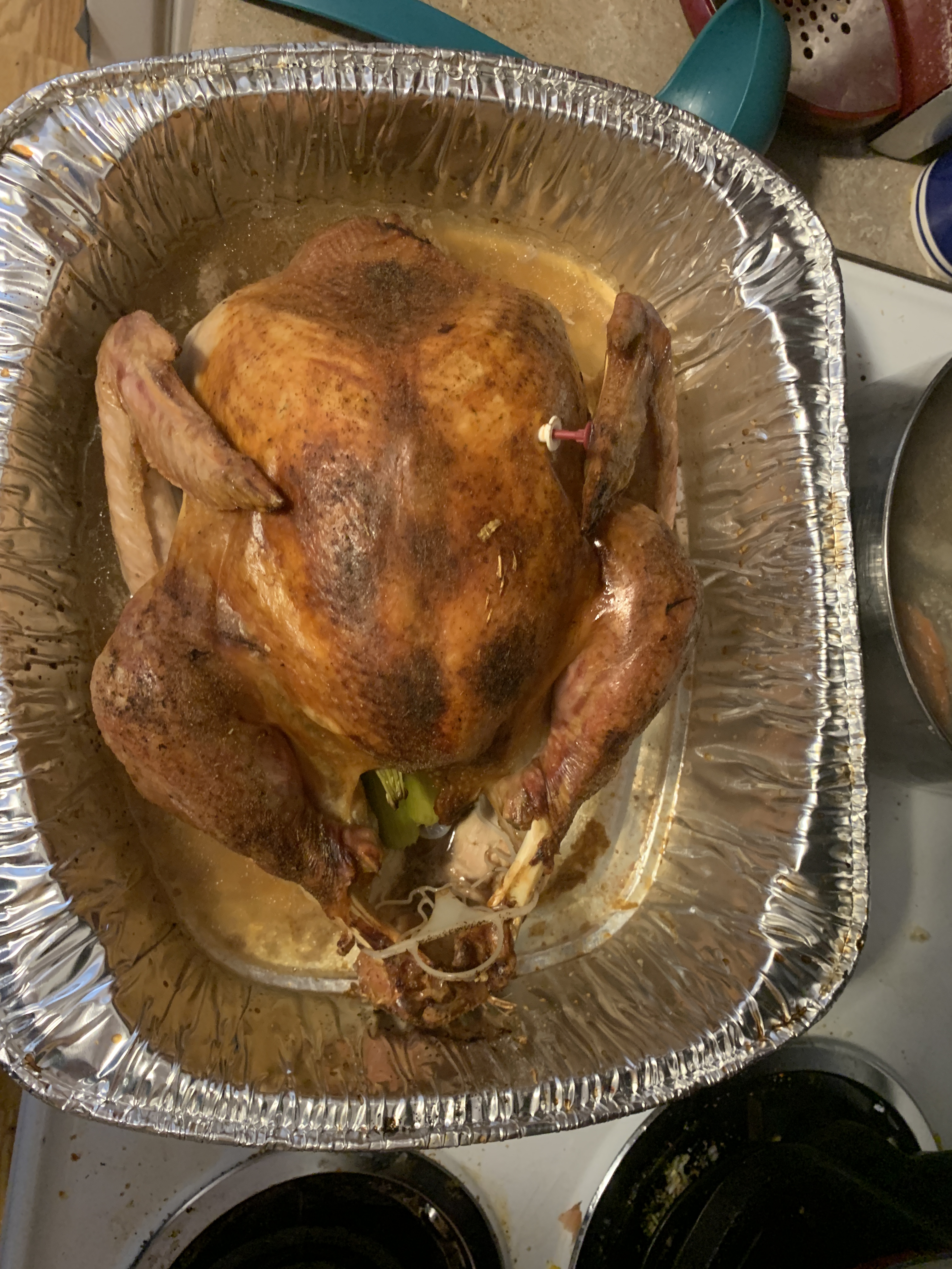 I also baste it with homemade turkey stock once every hour while it cooks. That’s a trick I learned from my sister-in-law, who simmers the neck and gizzards in water on the stove top for the duration of baking time to baste with. I do the same, but add onion, bay, celery, and carrots to the simmering stock, too.